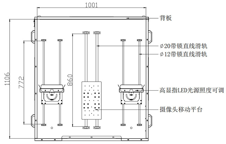 3.箱體內(nèi)部(如上圖)中間安裝有攝像頭移動平臺(如下圖), 平臺下安裝兩根帶鎖直線滑軌,平臺可前后移動,也可移動到某- -位置鎖緊滑軌固定。