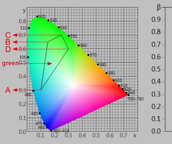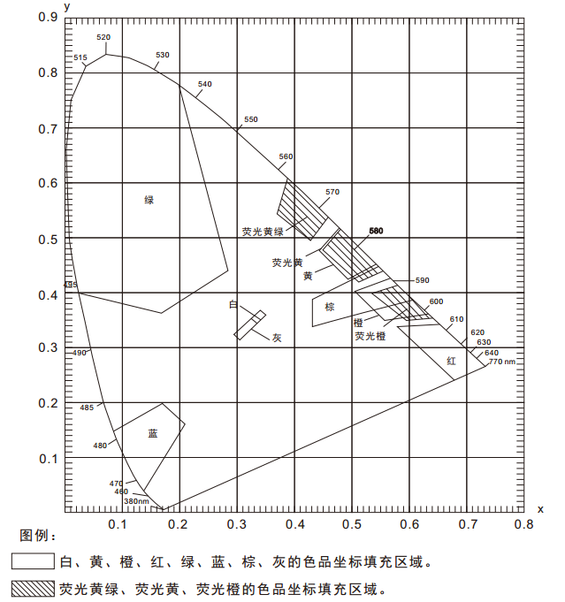 在《GB 2893安全色》、《GB/T 18833道路交通反光膜》等相關(guān)標(biāo)準(zhǔn)中,通常給出一塊顏色區(qū)域(多個色品坐標(biāo)點)和亮度因數(shù)要求,在D65/A光源和45/0幾何條件下,判定樣品是否落在對應(yīng)的顏色區(qū)域內(nèi),借此判定樣品是否滿足標(biāo)準(zhǔn)規(guī)定的色度要求。由于顏色區(qū)域為多邊形,如下圖所示,導(dǎo)致使用普通的分光測色儀無法完成判定。HRC68測色儀配合SQCT軟件的交通路標(biāo)測量模塊則可以輕松解決這方面的問題。