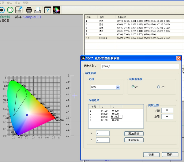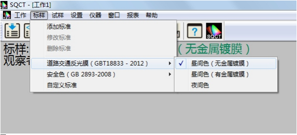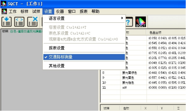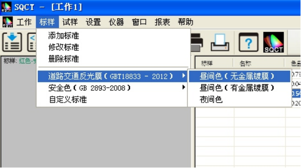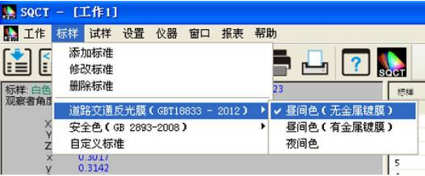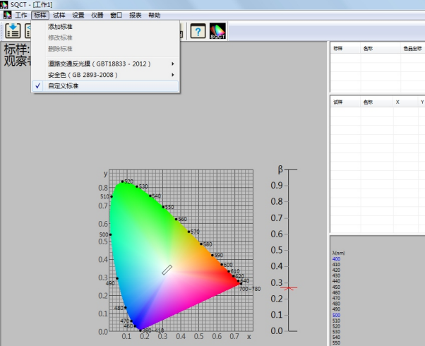 針對國內(nèi)交通路標(biāo)使用較多的標(biāo)準(zhǔn)GB/T18833,SQCT軟件將該標(biāo)準(zhǔn)中的標(biāo)準(zhǔn)色域納入其中,客戶只需根據(jù)自己需要進行選擇即可。