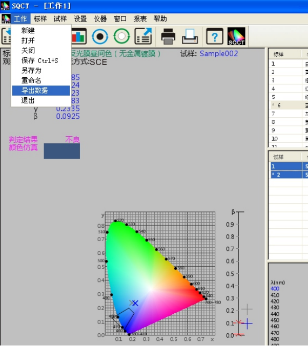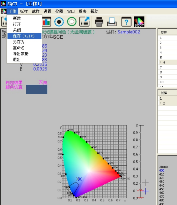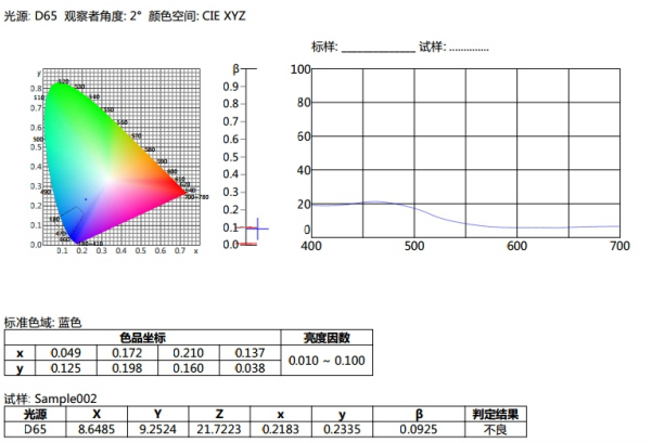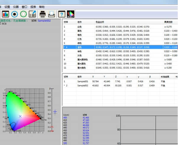 譬如如何判定藍色試樣是否在《GB/T 18833-2012道路交通反光膜樣》所規(guī)定的藍色區(qū)域內(nèi)(無金屬鍍層,晝間反光膜顏色),按照下面的步驟,將依次完成測量和判定。