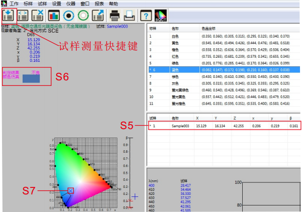 將測試樣品放在HRC68測量口徑上,貼緊,鼠標(biāo)點擊試樣測試快捷工具,如圖13所示。大約1.5秒時間,完成測試,測試數(shù)據(jù)如圖13中S5所示,在色品坐圖中的位置如S7所示,仿真及判定結(jié)果如S6部分所示。