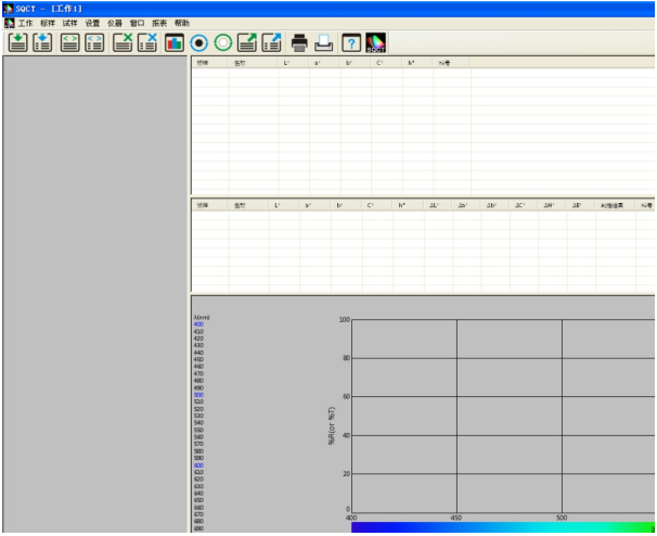 HRC68的交通路標(biāo)測試模塊主要是通過上位機軟件SQCT配合HRC68儀器實現(xiàn)的。 使用前需先安裝好SQCT上位機軟件,再連接HRC68儀器,然后打開上位機軟件,默認(rèn)為普通測試界面,如圖1所示,在該界面下可以完成CIE L*a*b、XYZ、ΔE*ab、ΔE*cmc、ΔE*00等色度數(shù)據(jù)的測試,詳細菜單和工具欄的介紹請參照該軟件自帶“色彩管理控制軟件使用說明書”,這里重點介紹交通路標(biāo)測試模塊。