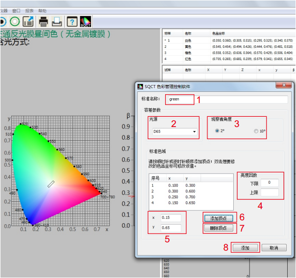 如圖5所示,在位置1處輸入標(biāo)樣名稱,位置2處選擇光源種類(默認(rèn)為D 6 5),位置3處選擇觀察者角度(默認(rèn)為2度),位置4處輸入亮度因數(shù)(除熒光物質(zhì)外,普通反射樣品亮度因數(shù)大于0小于1,即0<β<1)。在位置5處輸入色品坐標(biāo)點,然后點擊“添加頂點”按鈕,則新輸入的色品坐標(biāo)點出現(xiàn)在標(biāo)準(zhǔn)色域框內(nèi),重復(fù)上述步驟,依次輸入各色品坐標(biāo)點;對于輸入錯誤的色品坐標(biāo)點,先在標(biāo)準(zhǔn)色域框內(nèi)選中,然后點擊“刪除頂點”按鈕,則刪掉該頂點。全部輸入完畢,點擊位置8處“添加”按鈕,則完成“多邊形-容差標(biāo)樣”建立。