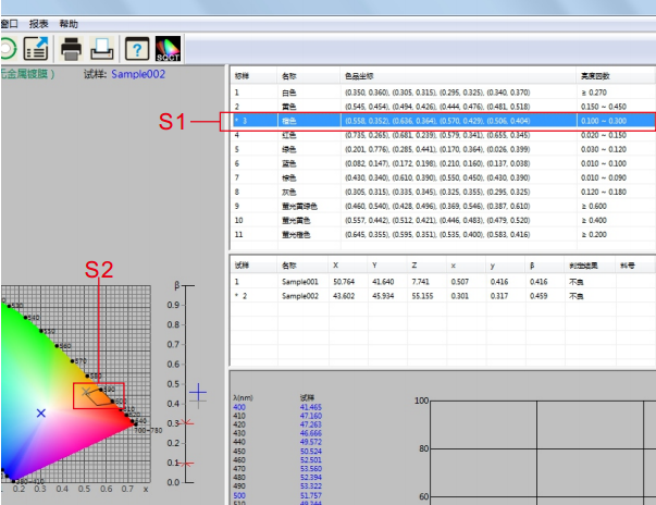 雙擊標(biāo)樣區(qū)域的藍色,如圖12中是S3所示部分,使藍色為當(dāng)前標(biāo)樣,藍色多邊形-容差標(biāo)樣(《GB/T 18833-2012道路交通反光膜樣》規(guī)定的藍色區(qū)域)則顯示在S4部分。