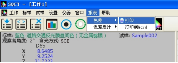 對試樣的測試結(jié)果可以通過打印菜單生成測試報表,選中要打印的試樣和標(biāo)樣,執(zhí)行“報表->色差->打印/打印到w o r d”或“報表- >色差累計- >打印/打印到word”,將測試結(jié)果打印出來,如圖15、16所示。
