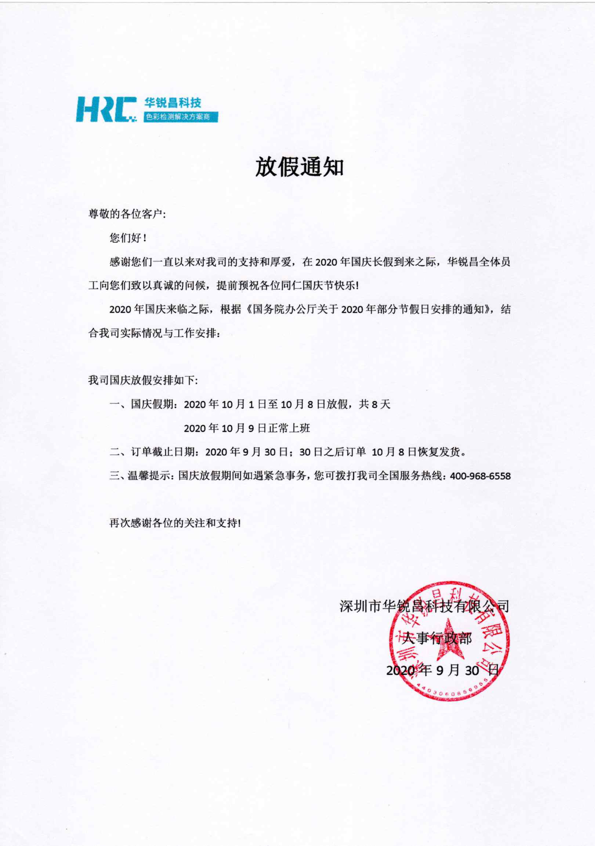2020年國(guó)慶放假通知_標(biāo)準(zhǔn)光源箱|對(duì)色燈箱|色差儀|光澤度儀|涂層測(cè)厚儀_HRC大品牌生產(chǎn)廠家