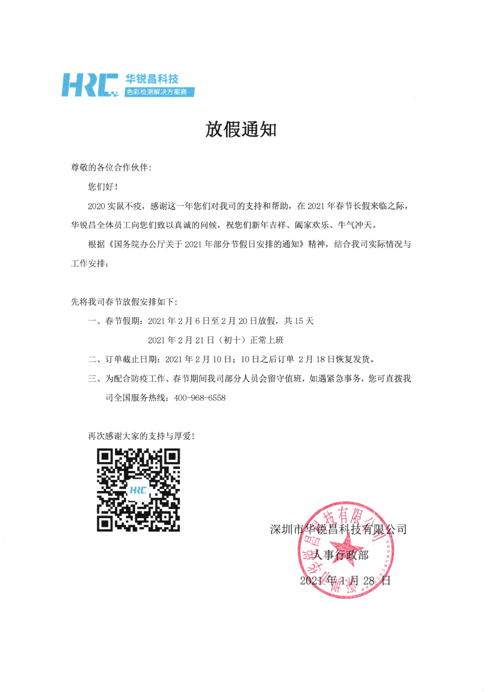 2021年春節(jié)放假通知_標(biāo)準(zhǔn)光源箱|對(duì)色燈箱|色差儀|光澤度儀|涂層測(cè)厚儀_HRC大品牌生產(chǎn)廠家