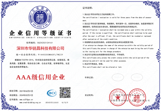企業(yè)信用評價AAA級為企業(yè)信用評價中最高的信用等級,是對深圳市華銳昌科技有限公司實力和市場信用的認(rèn)可,表示深圳市華銳昌科技有限公司經(jīng)營良好,發(fā)展前景廣闊,風(fēng)險防范能力強(qiáng),是最可信賴的商業(yè)合作伙伴。