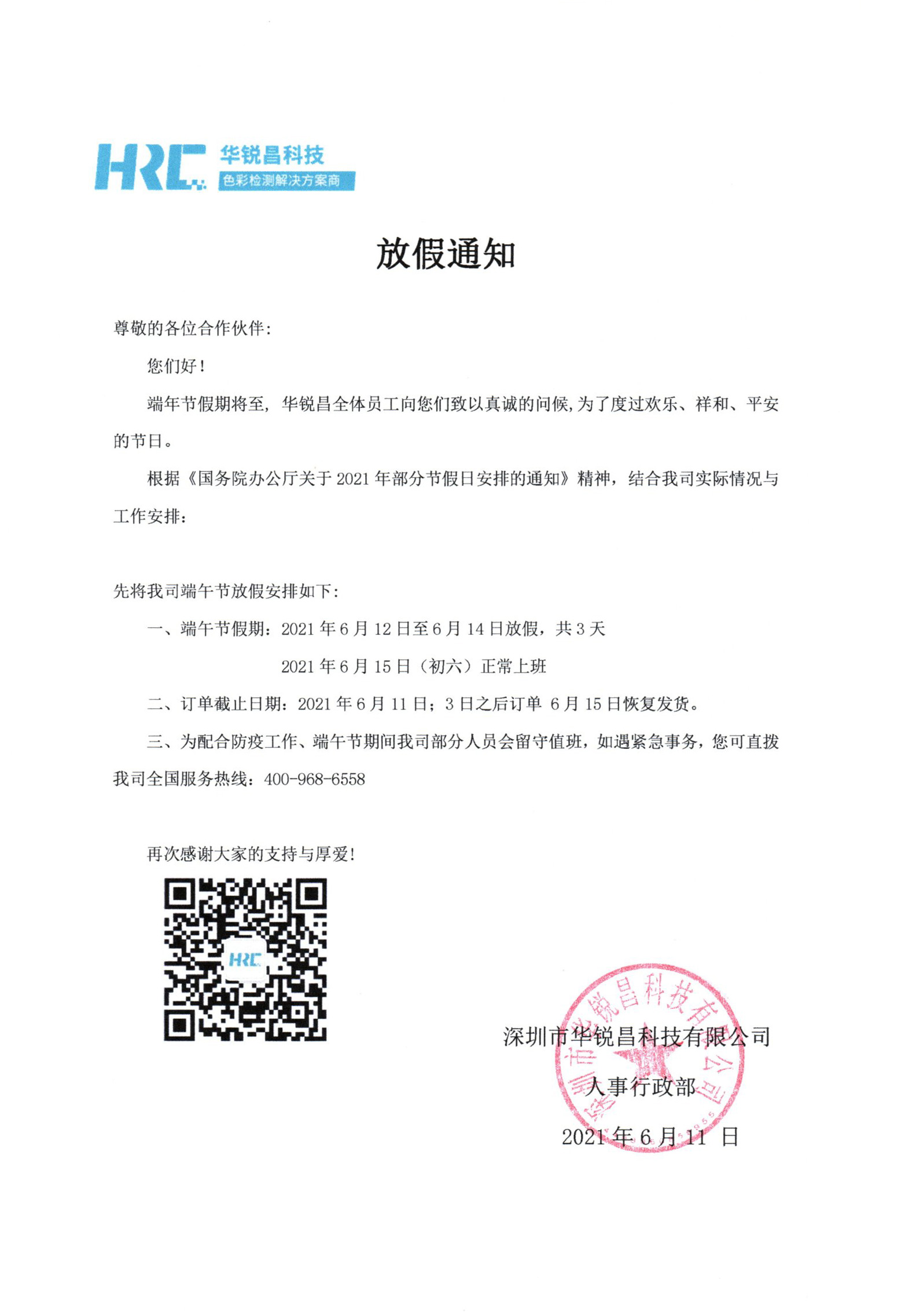 2021年端午節(jié)放假通知_標(biāo)準(zhǔn)光源箱|對色燈箱|色差儀|光澤度儀|涂層測厚儀_HRC大品牌生產(chǎn)廠家