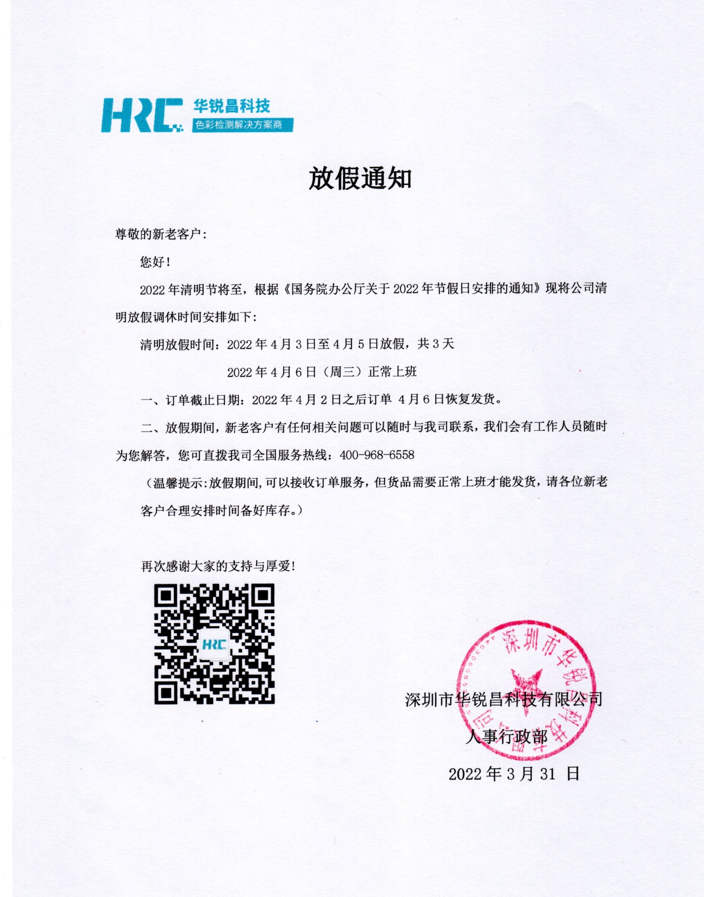 2022年清明放假通知_標(biāo)準(zhǔn)光源箱|對(duì)色燈箱|色差儀|光澤度儀|涂層測(cè)厚儀_HRC大品牌生產(chǎn)廠家