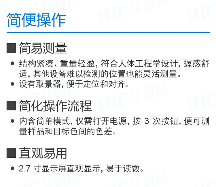 CM-23d分光測色計設(shè)有取景器,便于定位和對齊,內(nèi)含簡單模式,僅需打開電源,按 3 次按鈕,便可測量樣品和目標(biāo)色間的色差;2.7 寸顯示屏直觀顯示易于讀數(shù),快速測量,提高測量工作的生產(chǎn)力。