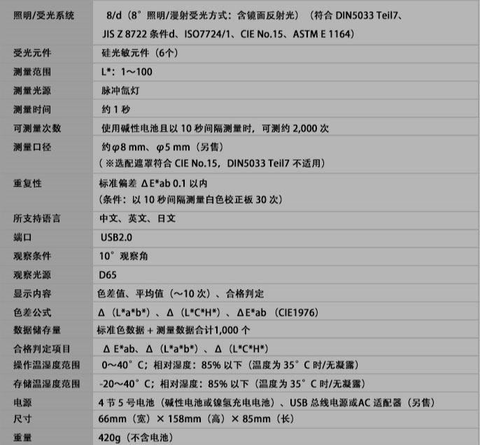 新一代經(jīng)濟型便攜色差計CR 10 Plus作為CR 10的升級款,在原有輕便靈活、便于攜帶的基礎(chǔ)上,更實現(xiàn)了與電腦的連接,可進一步擴展數(shù)據(jù)管理的范圍,滿足了質(zhì)檢人員頻繁快速的現(xiàn)場測量并給出即時結(jié)果,幫助企業(yè)實現(xiàn)高效的供應(yīng)商與產(chǎn)品的質(zhì)量控制;支持電腦應(yīng)用程序,使用更方便,測量儀內(nèi)置有電腦應(yīng)用程序,可進步擴展數(shù)據(jù)管理的范圍。(注:使用電腦應(yīng)用程序時,須另行準備電腦。)