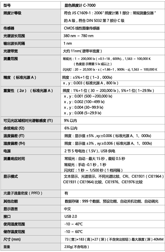 賽科尼可.世光SEKONIC顯色照度計C-7000是一款小巧、易用的光源(包括LED照明和EL照明)測量儀器,可提供CRI顯色指數(shù)、光譜輻射照度、峰值波長、三刺激值、色度、相關(guān)色溫、特征波長、色純度、照度以及差值測量的入門級解決方案,顯色照度計C—7000是一款輕便的手持式測量儀器,用于測量光源(包括全新的LED和EL光源)的色彩和照度。測量數(shù)據(jù)是以CRI顯色指數(shù)、三刺激值、照度、色度、特征波長、色純度、相關(guān)色溫和與目標的差值形式顯示的,C—7000可搭配另購的閃光同步線進行攝影閃光燈的光譜測量,作為標準配件隨附的實用軟件內(nèi)含了用于數(shù)據(jù)捕捉和分析的更多高級功能。
