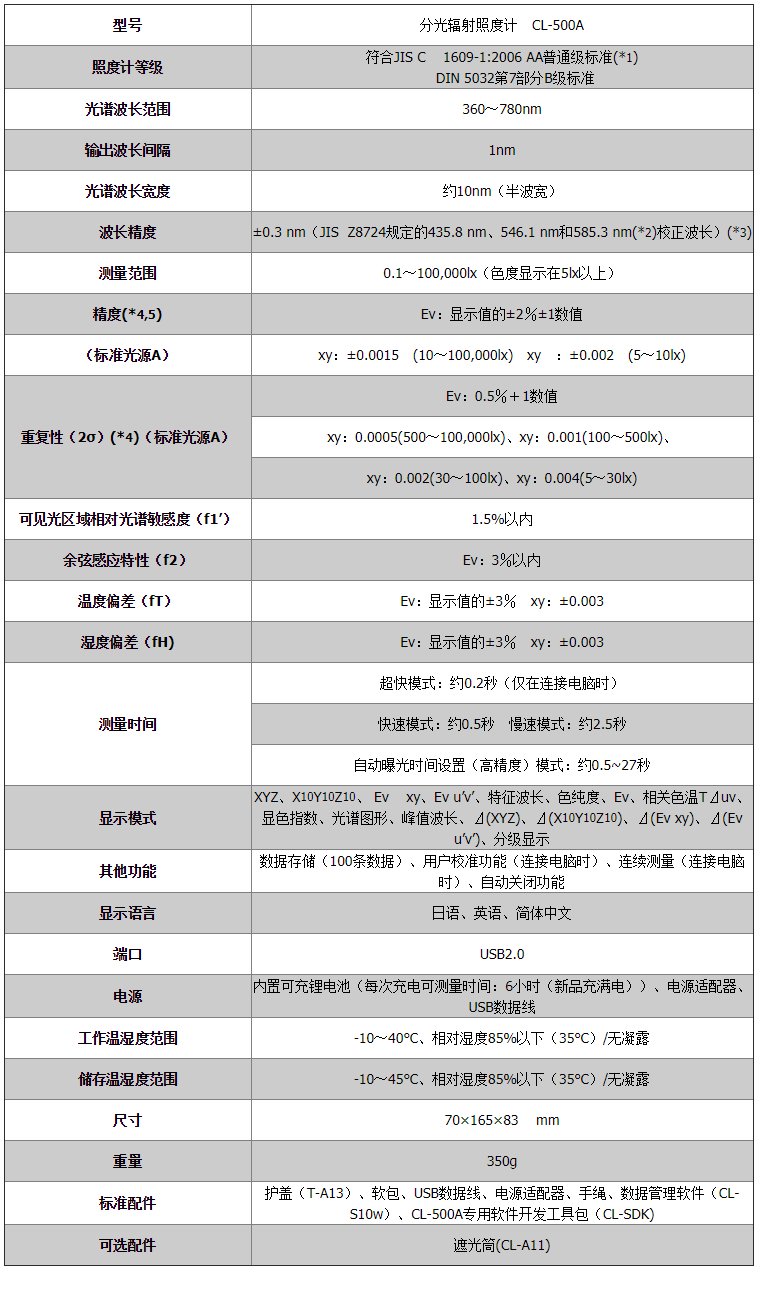 CL-500A符合DIN 5032第7部分B級標準和JIS C 1609-1:2006 AA普通級標準, 是首款符合DIN和JIS兩種標準的便攜型分光輻射照度計。