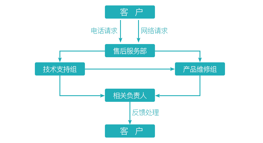 2、無論客戶是電話請求還是網(wǎng)絡請求,客服中心都會根據(jù)客戶反饋的問題進行分類后直接轉(zhuǎn)接相應部門,部門負責人會根據(jù)客戶請求進行處理并給出相應解答,處理結(jié)果將會交接給區(qū)域負責人,區(qū)域負責人將問題反饋給客戶并配合處理一切售后事務。