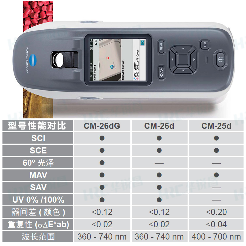 柯尼卡美能達(dá)的新一代CM-26dG系列,包含三款便攜式分光測色計(jì)型號(hào),高端旗艦型號(hào)CM-26dG和CM-26d擁有精湛的技術(shù)和業(yè)界快速的測量精度,其中,CM-26dG是二合一機(jī)型,可同時(shí)進(jìn)行色彩與光澤測量,CM-26d專注于色彩測量,CM-25d則是該系列的經(jīng)濟(jì)高效型號(hào),高性價(jià)比之選。
